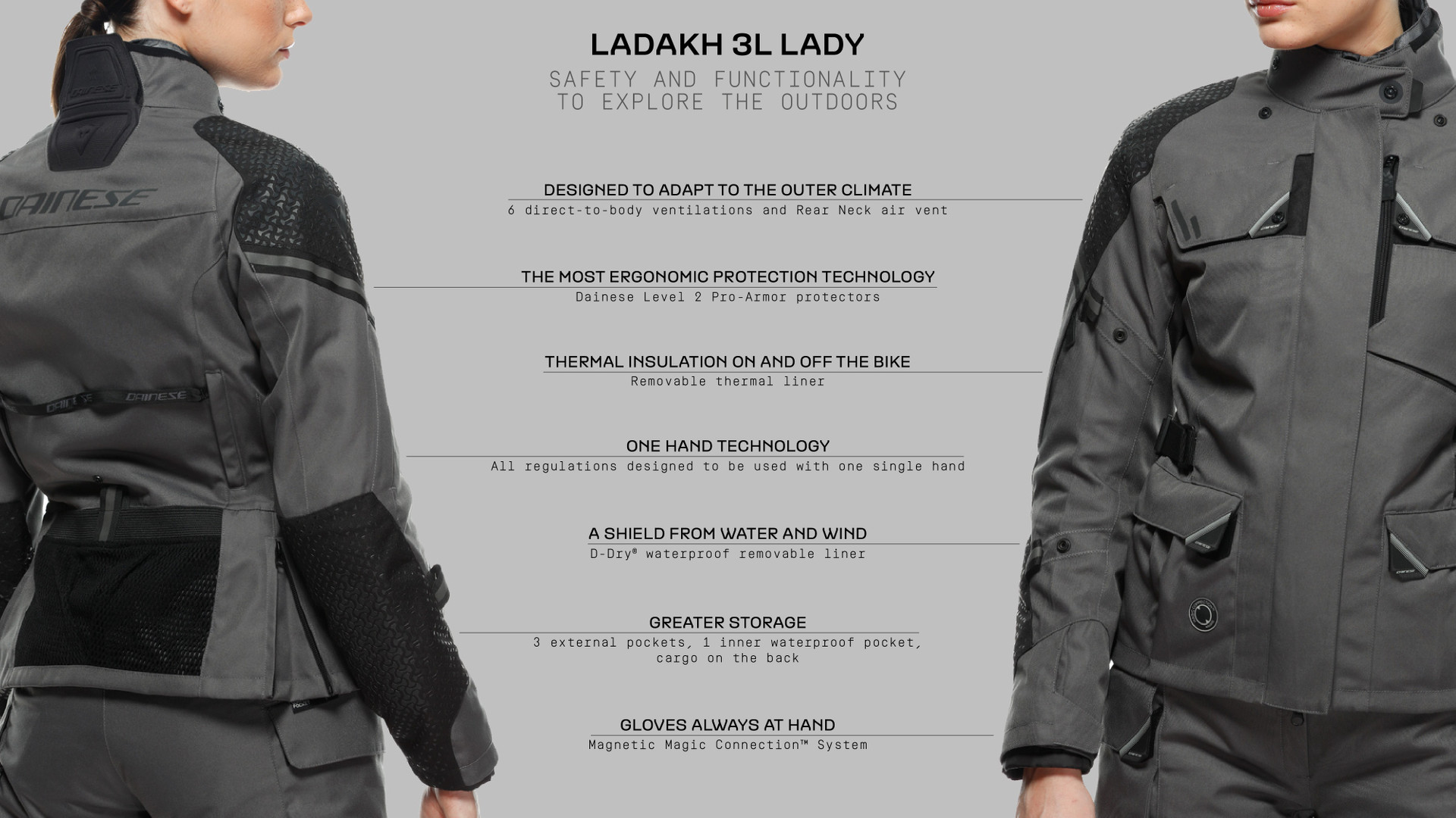 Ladakh 3L D-Dry® Lady features the integrated Dainese Magic Connection™ technology, with a magnetic system that allows compatible Dainese gloves to be secured conveniently to the jacket, so they’re always in reach and don’t get lost when refueling or during short stops.